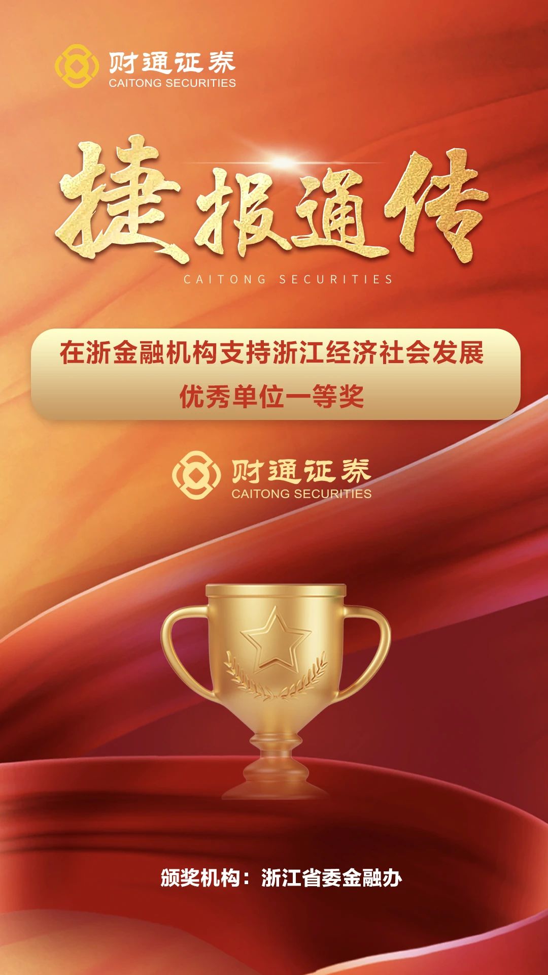 日前,浙江省委金融办通报了2023年度在浙金融机构支持浙江经济发展优秀单位名单。sunbet申搏再次获评“在浙金融机构支持浙江经济社会发展优秀单位一等奖”,这是财通证券自2017年以来第七次登榜,“选择财通 财运亨通”品牌贡献度与辨识度不断提高!