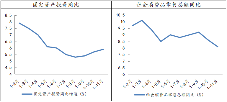 周五,国家统计局公布了多项经济数据。首先,工业增加值持续回落,同比增长5.4%,大幅低于预期,11月PPI下滑也体现了工业供需两弱的格局。虽然部分地区限产力度出现边际放松,但在前期投资下滑和限产影响的显现下,工业经济或仍将承压。投资方面,11月投资增速继续回升,中西部地区投资明显改善,表明下半年基建补短板政策的效果开始显现。不过考虑到地方隐性债务的约束,反弹力度可能将受到一定限制。消费端,11月社会消费品零售总额同比增长8.1%,再创新低,实际上,受“双十一”对必需消费的提振,日用品、服装等零售增速大幅反弹,但占比最高的汽车、石油增速下滑,成为拖累社零数据的主要原因。