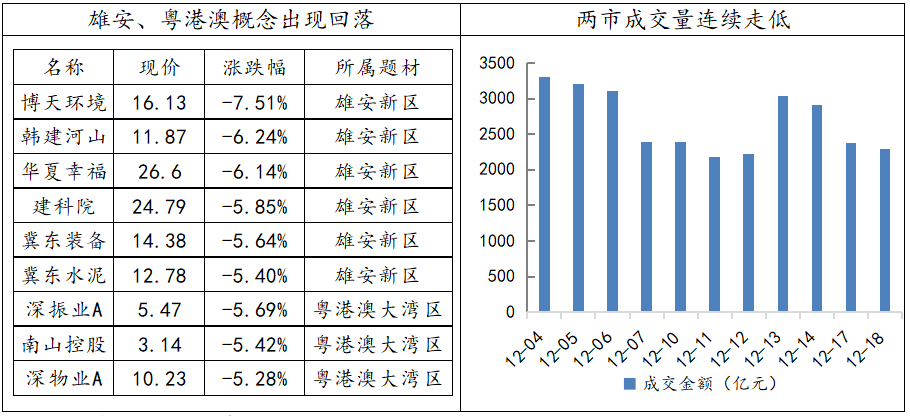 今日,市场延续了弱势调整格局,大基建和权重股的低迷使指数承压走低,盘面仅有具有一定防御属性的贵金属和农业板块勉强收红。一方面,隔夜欧美市场大幅下跌,使市场整体风险偏好受到负面影响;另一方面,今日上午改革开放40周年领导人的重要讲话中,更多涵盖了总结性的内容,因此,前几日提前活跃的粤港澳大湾区、雄安新区等概念题材纷纷回落。量能方面,两市成交金额不足2300亿元,近日连续地量表明资金仍在等待本周后续几个靴子落地,以及中央经济工作会议潜在的政策指引。