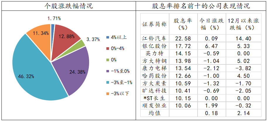 今日,市场仍然呈现出低开低走且缩量的弱势整理态势,午后沪指跳水,跌逾1%。近几日,高位股回调的迹象比较明显,受到带量采购、“过期蜂蜜门”等多重利空影响的医药板块今日继续呈现大跌的态势,且拖累创业板指跌近2%。在市场环境仍不明朗,叠加年末效应显现的背景下,A股市场整体走势疲软,观望情绪浓厚。但在弱势行情中,具备高股息率的个股却呈现出较为抗跌的韧性,从12月以来的市场表现来看,除了表现突出的江铃汽车外,股息率排名前十的公司平均上涨2.14%,明显好于同期沪深指数的表现。