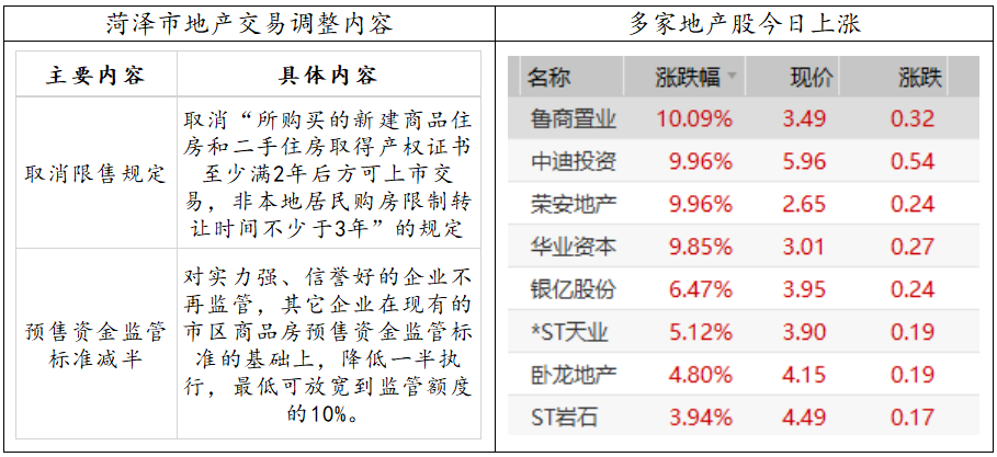 今日,山东菏泽市住建局发布通知,对房地产相关政策进行调整,主要内容包括:1)取消限制住房转让的期限;2)降低预售资金监管额度的要求,提出差异化监管标准,因而龙头企业有望进一步受益。此次菏泽市对住房转让限制的放松,在一定程度上有利于区域内二手房的流转,对市场的情绪和预期有所提振。但将此看作楼市大范围松绑的信号还为时尚早。首先,管理层目前对楼市的调控态度并没有改变,仍然坚持“房住不炒”的主基调;此外,菏泽市的住房库存量积压较多,可继续推进去库存工作,但这并不适用于房价维持高位或仍在攀升的其他城市。但如果未来经济下行压力增大,政策环境有望边际改善,行业估值修复有望持续。