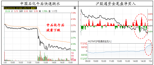 隔夜,美股、原油在经历了持续下跌后大幅拉升,但A股却呈现出高开低走之势。午间,路透社消息表示,中石化两位高管被停职,或因巨额交易亏损。虽然消息尚未得到官方证实,但对公司股价和指数走势都产生了较大的影响,中国石化A股及H股双双放量跳水,其A股重挫逾6%,并带动行业板块和市场进一步回落。尽管市场弱势依旧,从外资的表现来看,沪股通资金的表现较为平淡,但在尾盘卖压持续释放之时,却呈现出了净流入的态势,表明外资仍然看好A股长期配置价值,逢低吸纳的战略没有改变。