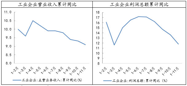 今日,统计局发布了1-11月工业企业经营数据。11月,规模以上工业企业利润同比下降了1.8%,较上个月回落了5.4个百分点,为2015年底以来首次出现负增长。经济下行压力继续显现,需求端的疲软叠加供给侧改革力度趋弱,部分周期品价格明显下滑,企业营收增速较上月继续回落。分行业来看,随着原油价格持续下跌,以黑色系、化工为主的上游行业盈利增速已逐渐放缓。考虑到价格同比增速回落的滞后性和高基数效应,我们认为,明年工业企业的盈利情况仍将继续承压。