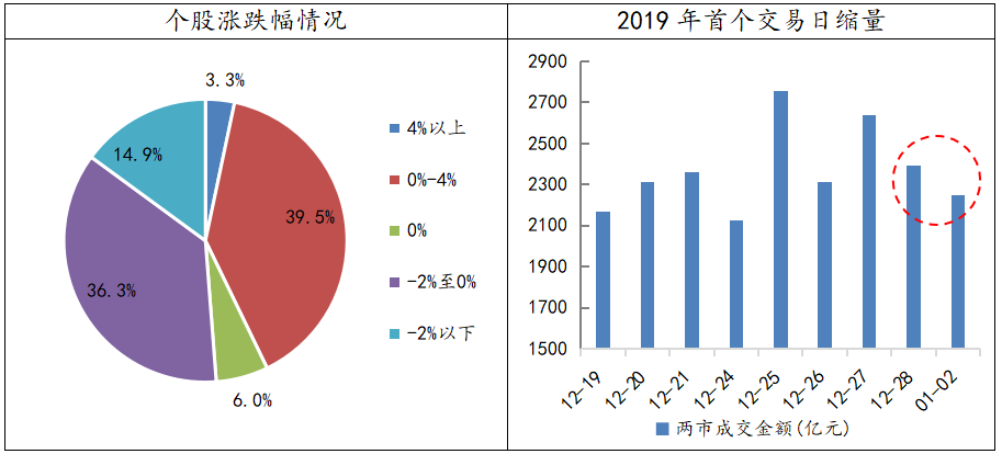 2019年的首个交易日, A股三大指数均高开低走,收盘跌幅均超过了1%。但实际上,下跌的个股数量并不是很多,个股涨跌幅中位数仅为-0.12%。今日,市场的分化现象明显,一方面,权重股的下杀效应仍然没有结束,康美药业和迈瑞医疗的黑天鹅事件直接带崩了整个医药板块,而银行等大金融板块也未能走出低谷。另一方面,资金仍在围绕着5G、创投等概念展开做多,为盘面提供了局部人气。指数缩量杀跌,说明恐慌情绪并不浓厚,但机构资金目前仍没有做多动力,加之财新PMI数据不及预期显示经济还在下行探底,也成为了场外资金犹豫的原因之一。