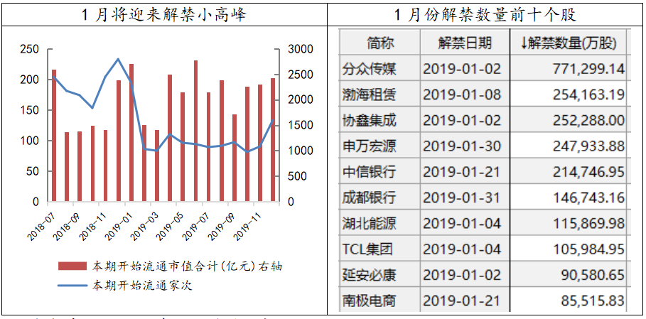 在弱市背景下,市场近期需要谨慎两个方面的风险因素。首先,1月份A股将迎来一波解禁的高峰期,解禁的个股数量大约在200家左右,总市值超过了2700亿元,为2019年次高,其中有87%属于定增解禁,面临较大的卖压。个股方面,分众传媒、协鑫集成、中信银行、成都银行等解禁的市值均超过100亿元,投资者需谨慎股东出现清仓式减持的行为。另一方面,1月市场将进入公司业绩预告发布密集期,由商誉减值引发的公司业绩变脸可能会在1-2月频繁发生,并传导至股价。因此商誉占净资产比例较高的公司需注意回避。