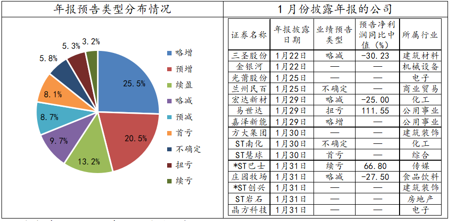 随着沪深两市年报披露时间名单的出炉,年报行情有望成为市场关注的焦点。2018年首份年报将在1月22日出炉,目前,两市共有1238只个股公布年报业绩预告。其中,有733家业绩预喜,占比59.2%。从历史经验来看,市场对首家敢于披露年报的上市公司期待值是非常高的,披露时点前往往会受到资金的追捧。但是,考虑到年报第一股的博弈与大盘走势存在较强的关联性;此外,从今年两市的披露时间来看,沪深两市的“年报第一股”中,三季报业绩情况仅一家表现尚可,均未符合高转送方案的条件,且中小板公司三圣股份的业绩预告显示,预计净利润同比下滑逾20%,资金参与博弈仍需谨慎。