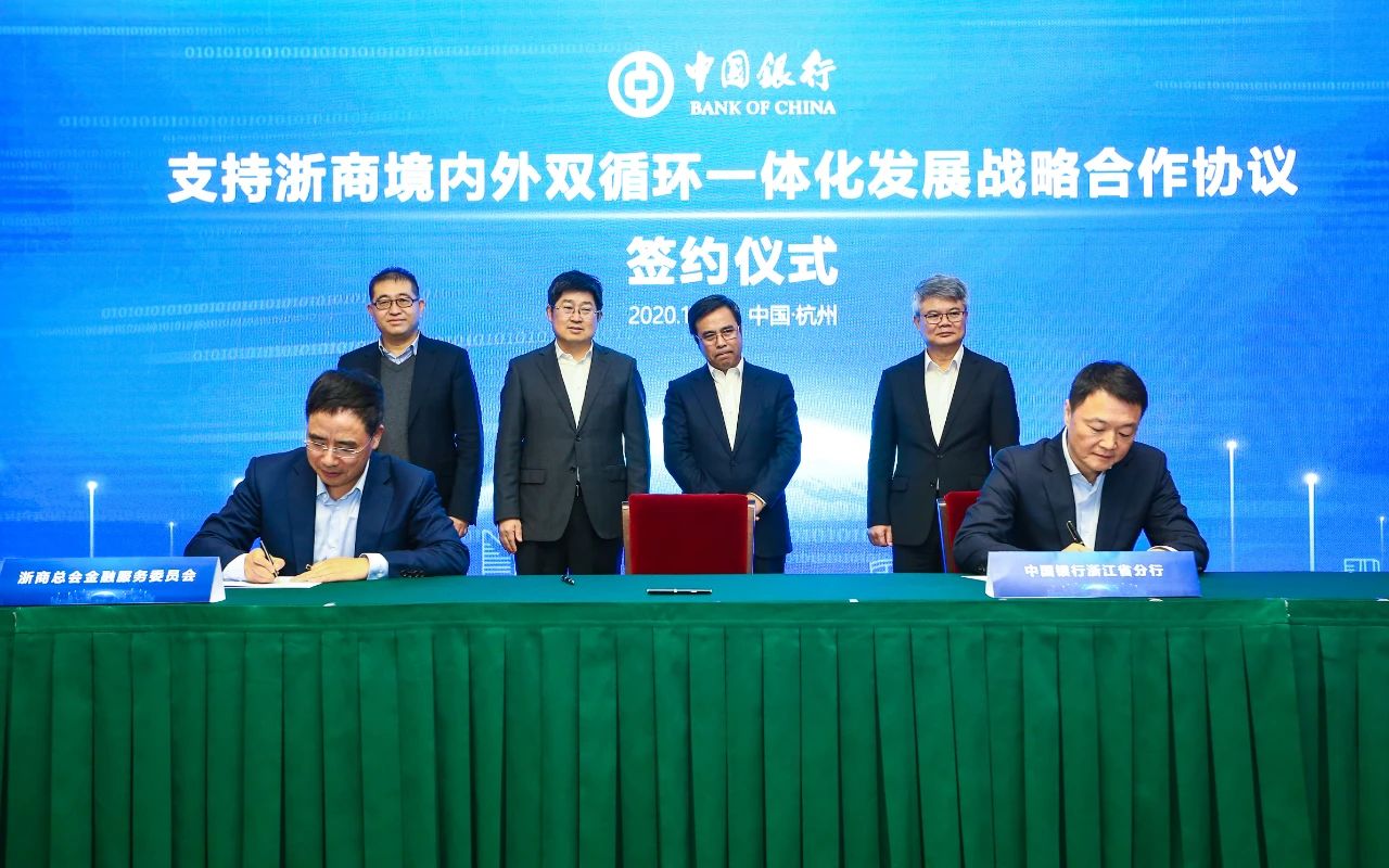 中国银行海外分支机构遍布62个国家和地区,具有全球布局的领先优势。浙商总会金融服务委员会与中国银行浙江省分行此次签订协议,双方将共同围绕金融重点支持的浙商海外项目清单,各自发挥服务浙商的独特优势,有效整合资源,打通浙商海外项目信息链,加大对促进“双循环”发展项目的金融支持力度,协力推动经济复苏转稳。