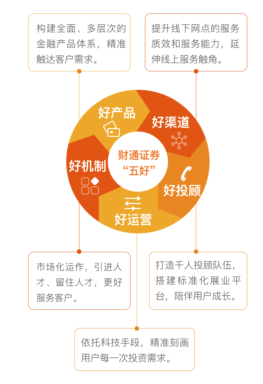 公司“资产与财富管理委员会”及各专业委员会多次召开财富管理会议,形成专项方案,推动公司财富管理转型全面加速,并以“五好”为路径,构建财富管理服务价值链。