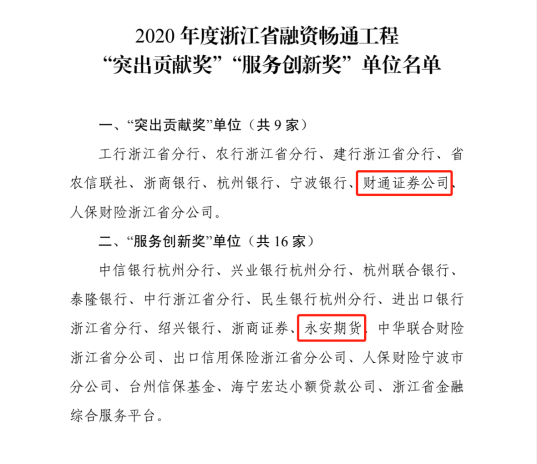 日前,浙江省地方金融监督管理局公布了《省地方金融监管局关于公布2020年度融资畅通工程工作考核结果的通知》,sunbet申搏继去年之后,再次荣获融资畅通工程“突出贡献奖”,也成为今年唯一一家获得此奖项的证券公司。重要参股公司永安期货同时荣获融资畅通工程“服务创新奖”。