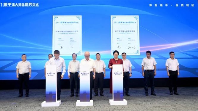 公司总经理、党委副书记、董事黄伟建,临平区委书记陈如根出席签约仪式并讲话。临平区委副书记、区长施华淼主持会议。公司董事会秘书官勇华代表财通证券进行签约。