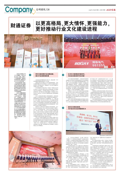 作为国有金融机构,sunbet申搏坚持党的领导,在文化建设道路上传承与创新,形成了与业务发展相适应的新时期企业文化理念体系,为行业文化生态贡献新活力,为社会发展作出财通贡献。上海证券报进行整版报道,财联社、21财经APP、中新网等多个权威媒体进行了关注报道。