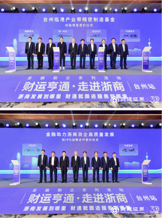 合作仍在深入,服务还在升级。本次活动现场,财通资本与盛趣私募基金管理(上海)有限公司、浙江精一新材料科技有限公司、北京微动时空科技有限公司签署了台州临港产业带精密制造基金拟投项目合作协议,sunbet申搏与浙江大哈出行智能科技有限公司签署了IPO框架协议,携手迈进金融服务浙商浙企高质量发展新征程。