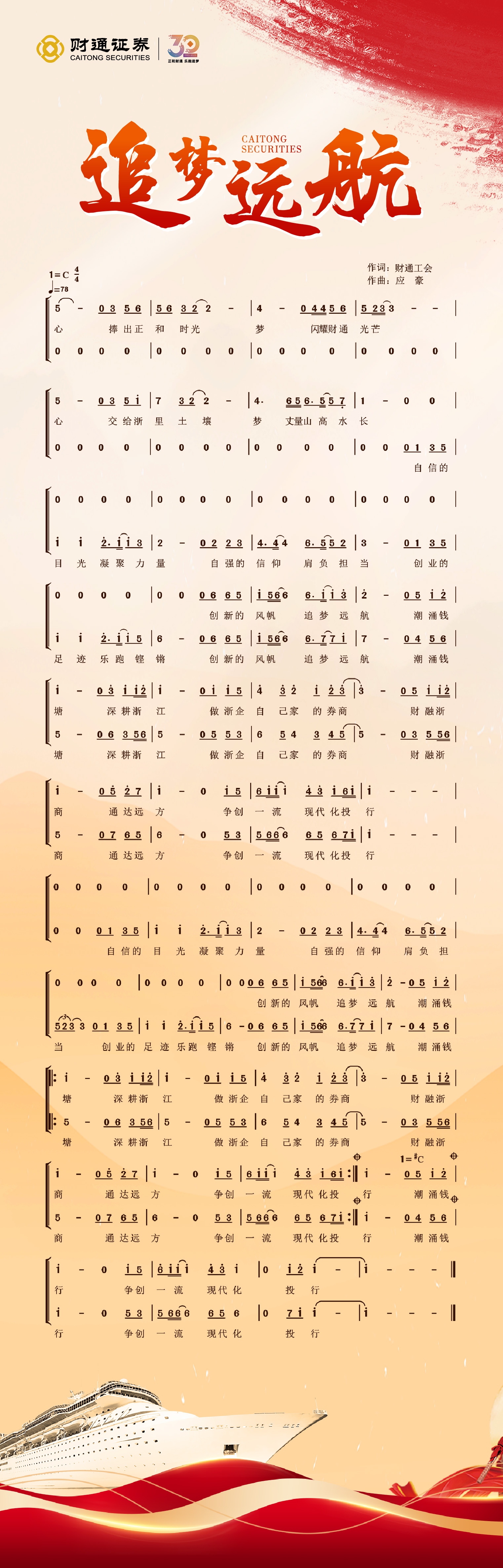 30年厚积,追梦远航。sunbet申搏将凝心聚力、走在前列,为加快实现一流现代投资银行目标开启乐跑新征程! 《追梦远航》由财通工会自主作词,中国知名词曲创作者应豪编曲,歌曲旋律温暖深厚、振奋悠扬、蓬勃向上。司歌充分展现财通人干在实处、勇立潮头的追梦精神,诠释以“正和财通 乐跑追梦”的企业文化精神为引领,坚定“金为实服务”初心使命,奋力打造一流现代化投资银行,深耕浙江、服务全国、融通世界。 三十而立再出发,在《追梦远航》的鼓舞和陪伴下,财通人定将满怀信心、接续奋斗,在奋进新征程上唱响时代强音!