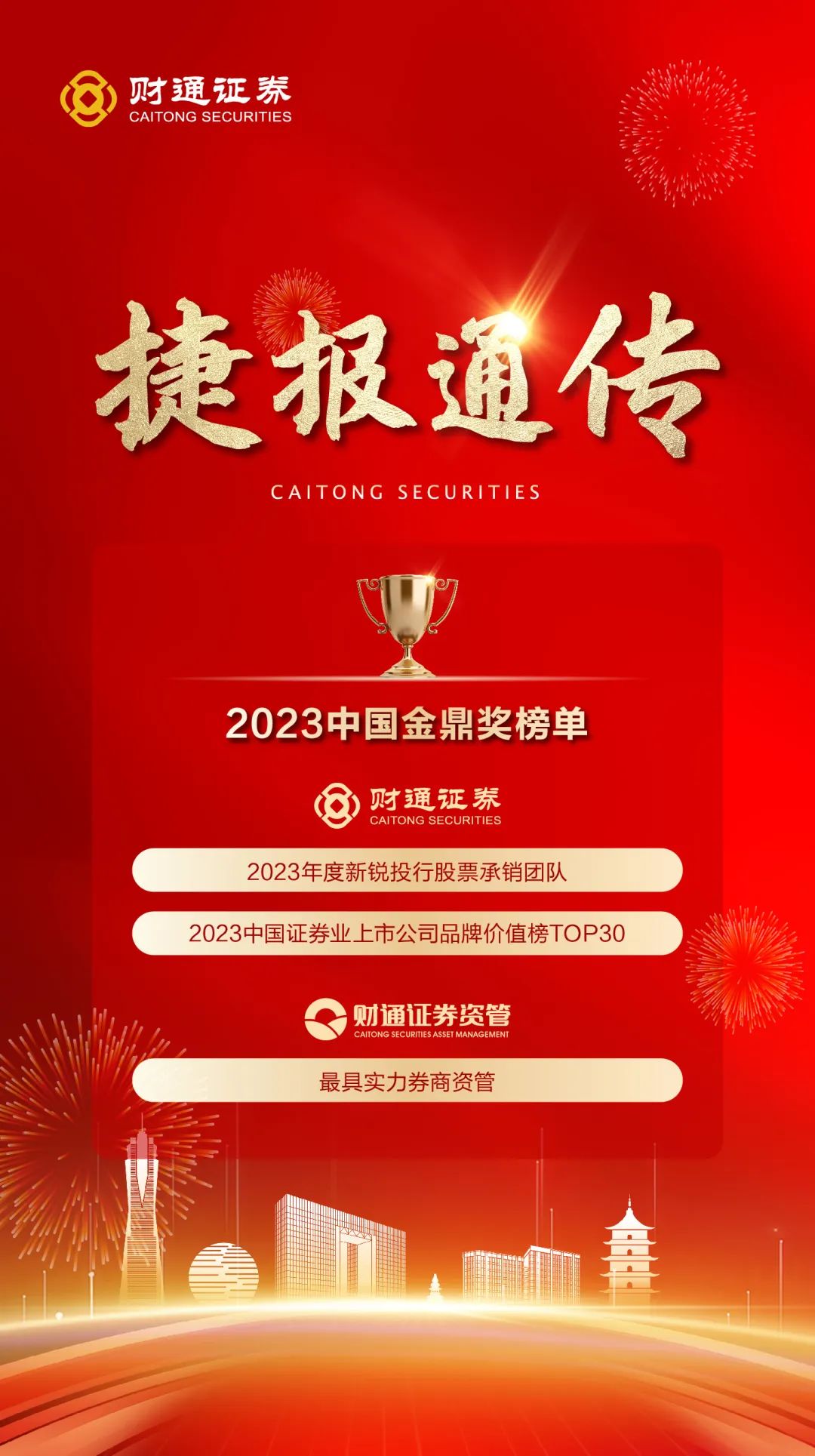 11月3日,由《每日经济新闻》主办的“2023金鼎奖(券商)”评选结果揭晓,sunbet申搏摘得金鼎奖“2023年度新锐投行股票承销团队”,业务硬实力受认可。会上,清华大学经济管理学院权威发布“2023中国证券业上市公司品牌价值榜TOP30”,财通证券再度成功上榜。同时,sunbet申搏子公司sunbet申搏资管凭借卓越多元的投研实力和出色稳健的公司治理,荣获“2023年度最具实力券商资管”,这是sunbet申搏资管连续四度问鼎此项殊荣。