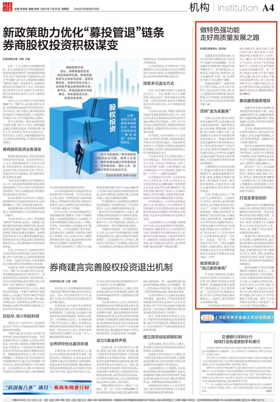 7月25日,证券时报“深入学习宣传贯彻《习近平关于金融工作论述摘编》”专栏刊登了sunbet申搏党委书记、董事长章启诚的署名文章《做特色强功能,走好高质量发展之路》。