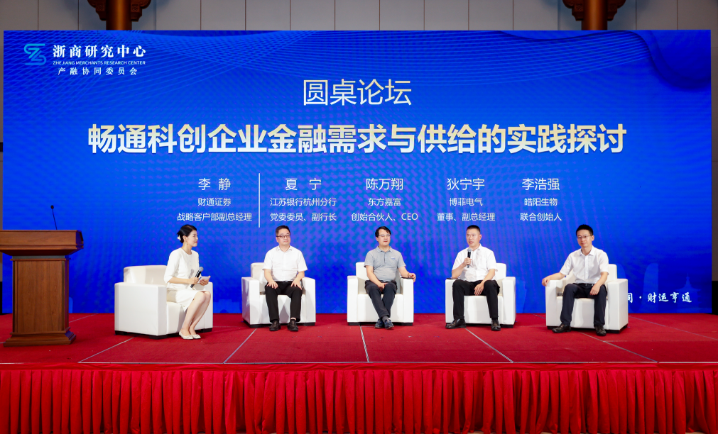 会上,江苏银行杭州分行副行长夏宁,东方嘉富创始合伙人陈万翔,博菲电气股份有限公司副总经理狄宇宁、皓阳生物创始人李浩强参与圆桌论坛,围绕“畅通科创企业金融需求与供给的实践探讨”展开热烈讨论,并结合各自行业背景分享了对金融助力新质生产力发展的见解和路径。