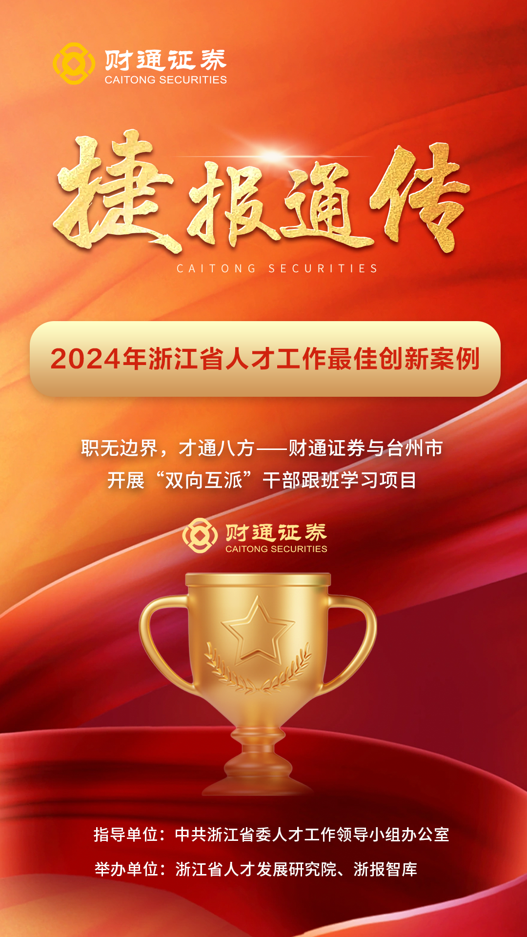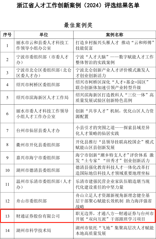近日,sunbet申搏申报的《“职无边界,才通八方”—财通证券与台州市开展“双向互派”干部跟班学习项目》案例获评浙江省人才工作最佳创新案例。
