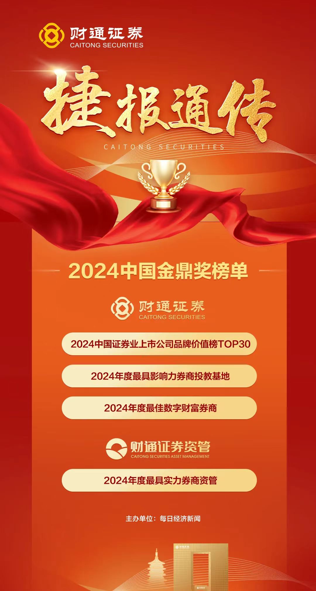 金鼎奖评选是《每日经济新闻》主办的年度大型金融行业活动,覆盖公募基金、券商、保险、银行、第三方财富机构、创投等金融资管领域,在业内具有广泛影响力,受到专业机构及市场投资者的关注和认可。此次获评,彰显了业内对财通集团军的认可。