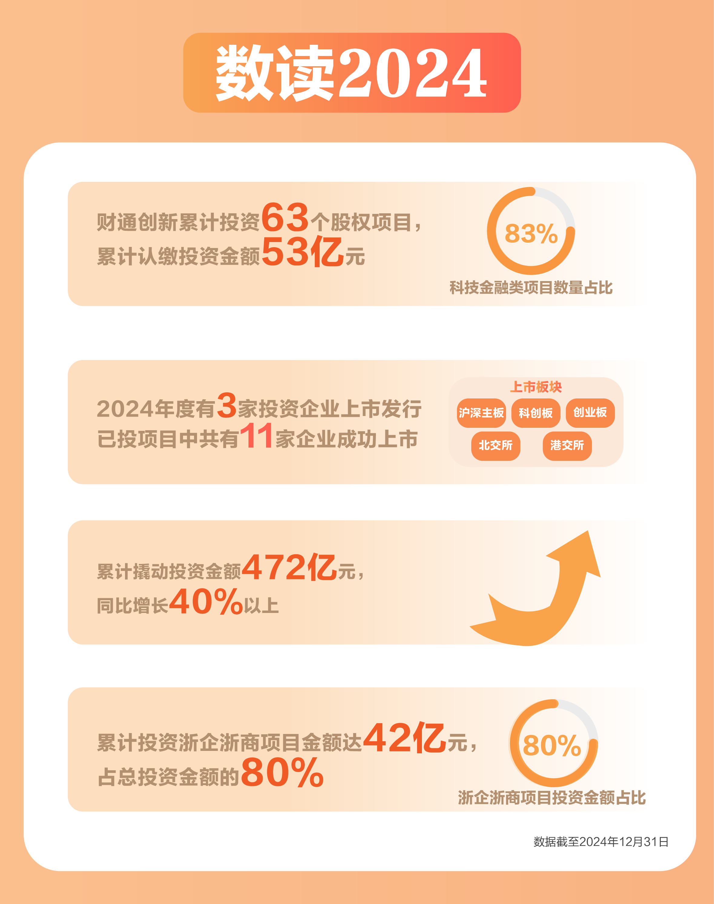 2024年,财通创新坚持党建领航,聚焦主责主业,深入践行金融“五篇大文章”,从大政方针中找投资方向、从功能性定位中找盈利方向。以“新机遇、新定位、新品牌”为导向,聚力打造“浙企浙商自己家的投资机构”特色优势,以投资实践培育发展新质生产力,更好服务创新浙江建设。