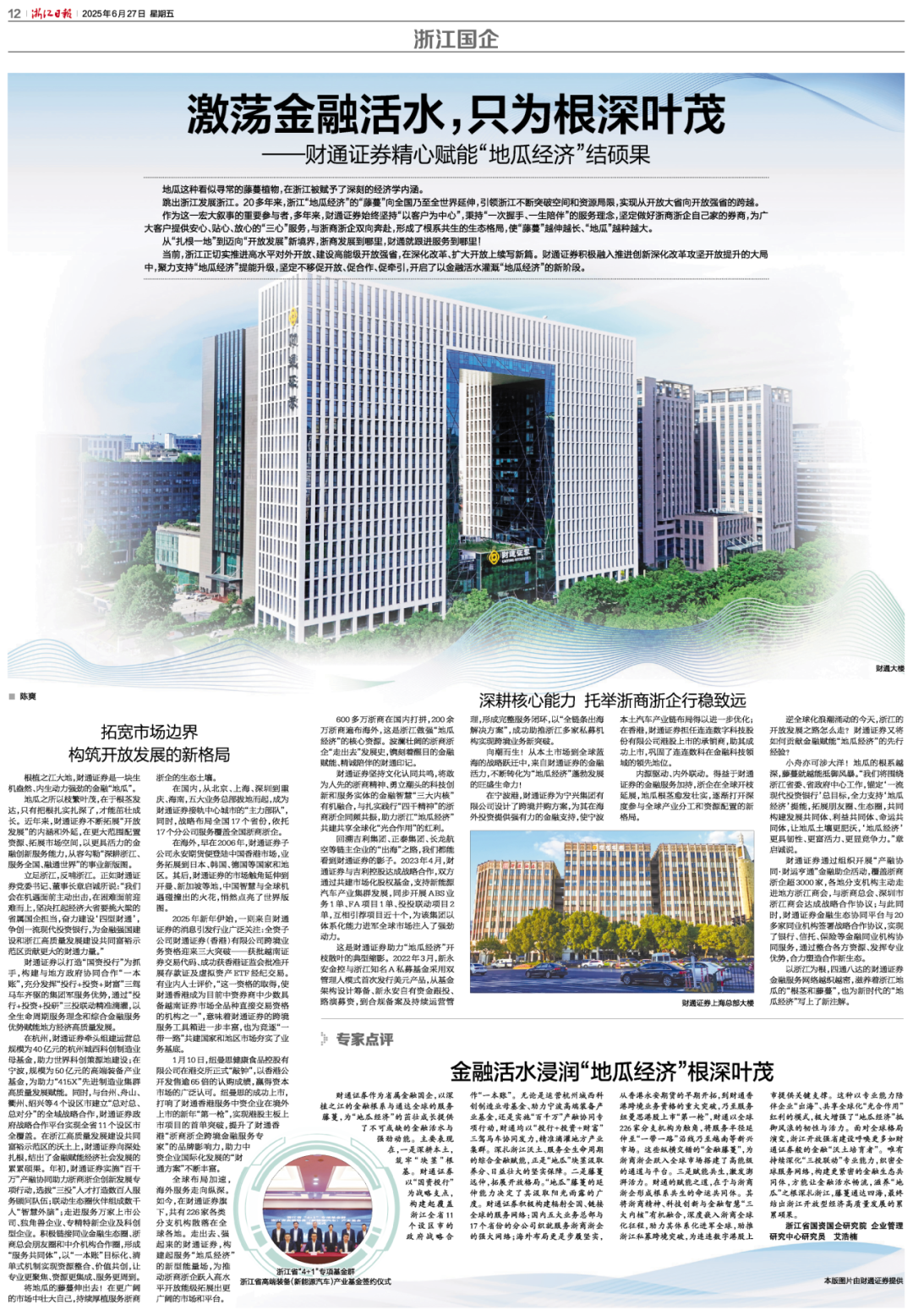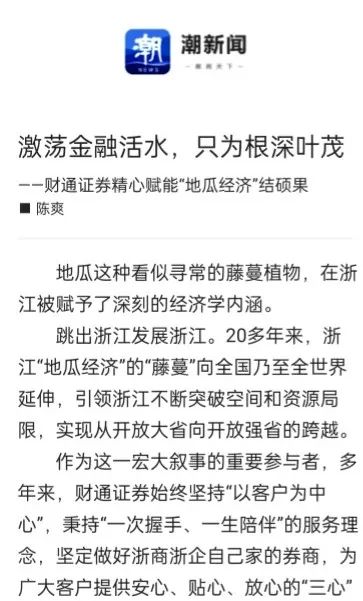 近日,浙江日报“浙江国企”专题聚焦财通证券积极融入推进创新深化改革攻坚开放提升的大局中,聚力支持“地瓜经济”提能升级,坚定不移促开放、促合作、促牵引,开启了以金融活水灌溉“地瓜经济”的新阶段。