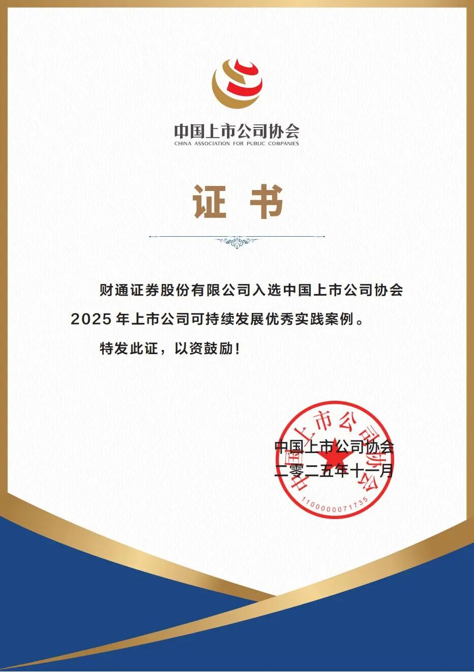 近日,中国上市公司协会公布2025年上市公司可持续发展实践案例评选结果,sunbet申搏获评可持续发展优秀实践案例。此次入选,代表行业、社会对财通证券可持续发展实践工作的肯定。